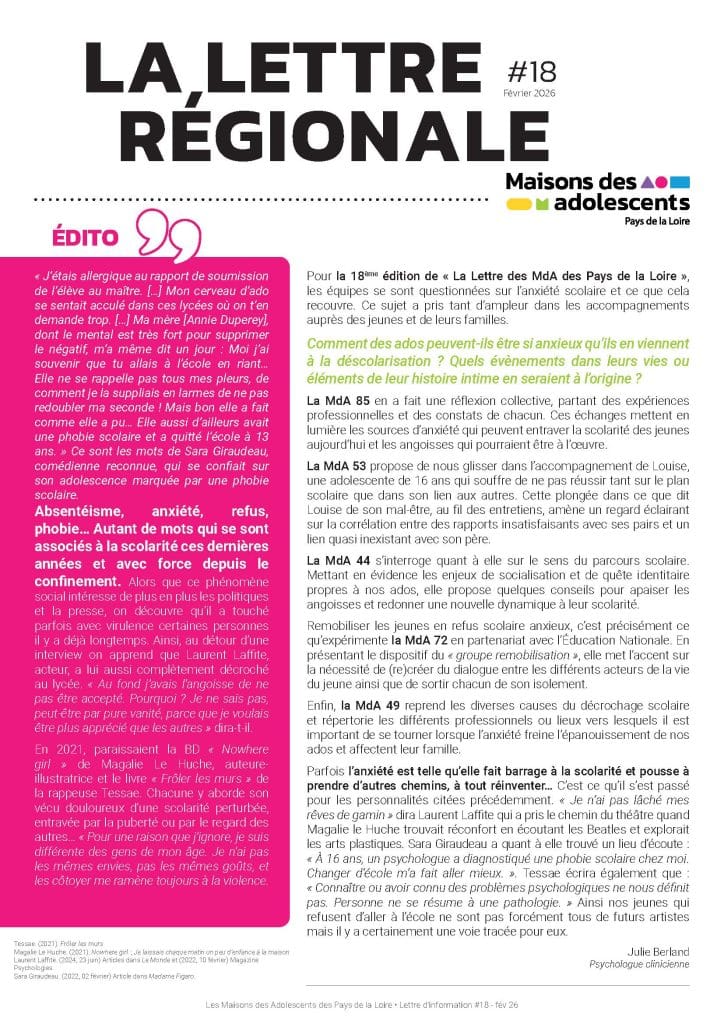 Les équipes des cinq Maisons des Adolescents de la région des Pays de la Loire élaborent ensemble une lettre semestrielle sur des thématiques choisies autour de l’adolescence :
